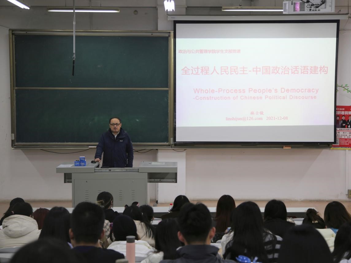 学院副院长林士俊为2019级党员和入党积极分子讲授《全过程人民民主——中国政治话语构建》党课