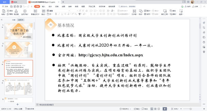 本次活动包括赛事宣讲以及政院科研力量后备等内容介绍。活动伊始,科技创新部对新生进行赛事宣讲,讲解关于“互联网+”、山东省大学生科技创新大赛、“挑战杯”中国大学生创业计划竞赛、“挑战杯”全国大学生课外学术科技作品竞赛、国家级全国大学生创新创业训练计划等多项赛事相关内容,内容包括PPT讲解、视频观看以及介绍全年科技创新类赛事目录。