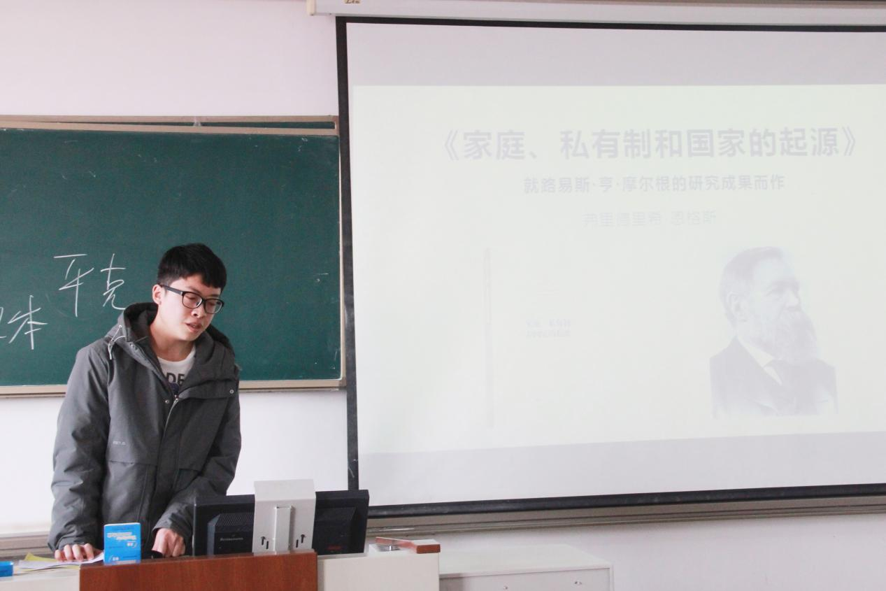 2022级杨深煦同学分享的书籍是恩格斯阐发历史唯物主义基本理论的重要著作——《家庭、私有制和国家的起源》,他从“两种生产”理论、家庭的起源和发展过程、私有制和阶级的产生过程和消亡趋势以及国家起源、本质和消亡的历史必然性这四个方面阐述了书中的理论内容,借助表格形式对家庭的发展进行了分析,最后与同学们分享并解读了书中自己感兴趣的文段。