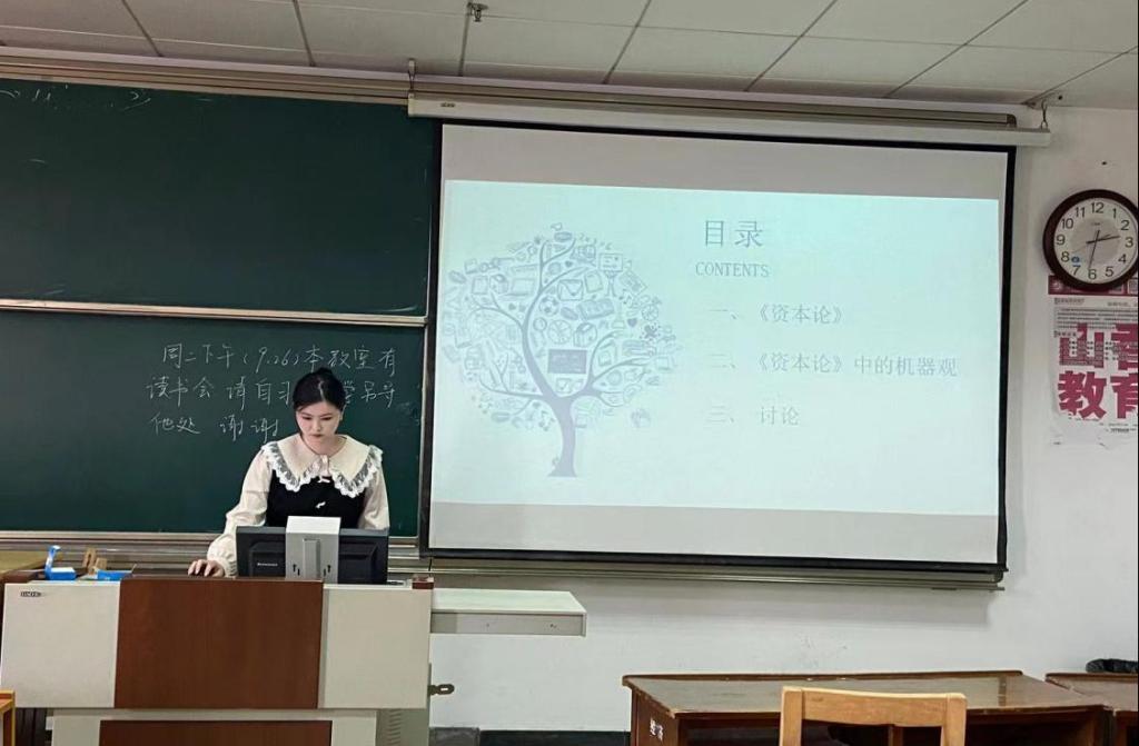 2022级明晨同学分享的是《资本论》,她从技术维度、历史维度、社会维度三个方面展开,阐述了从工具到机器的演进、使用机器产生的变化以及机器的资本主义应用批判。她通过“机器与机器资本主义运用相分离”与同学们讨论了“机器排挤工人”的观点。