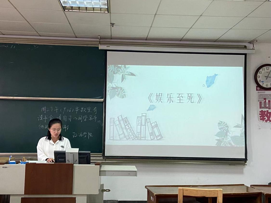 2023级孙红轩同学分享的是尼尔·波兹曼的《娱乐至死》,她为同学们详细介绍了作者与本书的创作背景,接着她谈到,一切公众话语都日渐以娱乐的方式出现,并成为一种文化精神,一切文化内容都心甘情愿地成为娱乐的附庸。面对这种情况,她认为大家要保持批判性思维,追求深度的知识和理解。