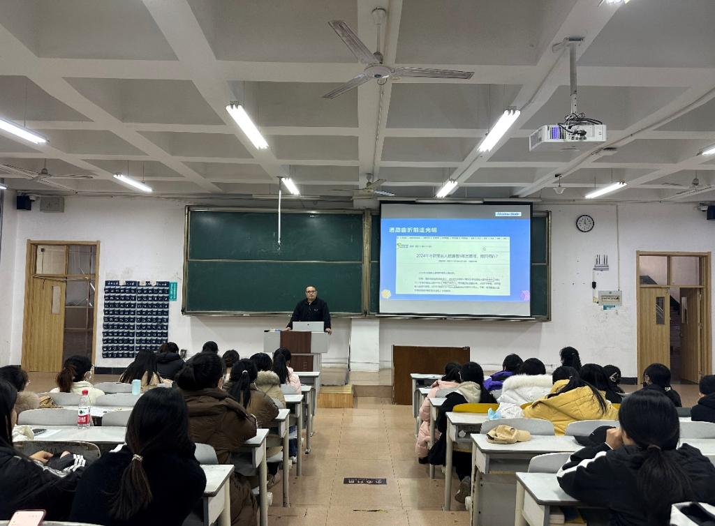 于A105教室召开2020级职业规划指导大会,副院长林士俊为2024届毕业生讲授“端正就业思想,调整生涯规划”就业教育思政课。