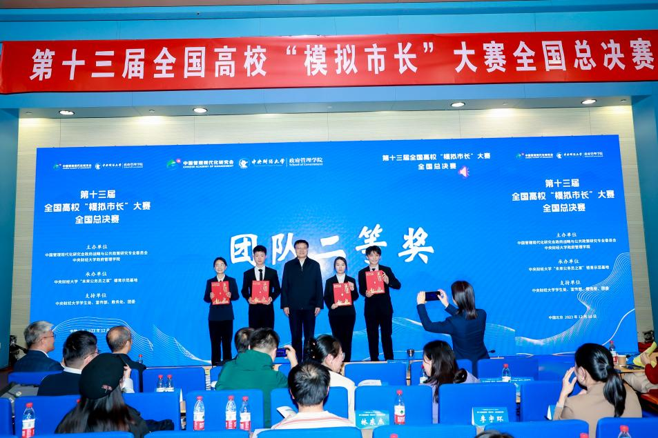 (通讯员:余恒 摄影:余恒)12月10日,第十三届全国高校“模拟市长”大赛全国总决赛在北京中央财经大学圆满收官。大赛由中国管理现代化研究会政府战略与公共政策研究专业委员会、中央财经大学政府管理学院主办,中央财经大学“未来公务员之家”德育示范基地、公共管理研究会承办。本届“模拟市长”大赛自启动以来,共吸引近百余所高校近三百支队伍参赛,经专家评审,最终来自中央财经大学、脱裤吧