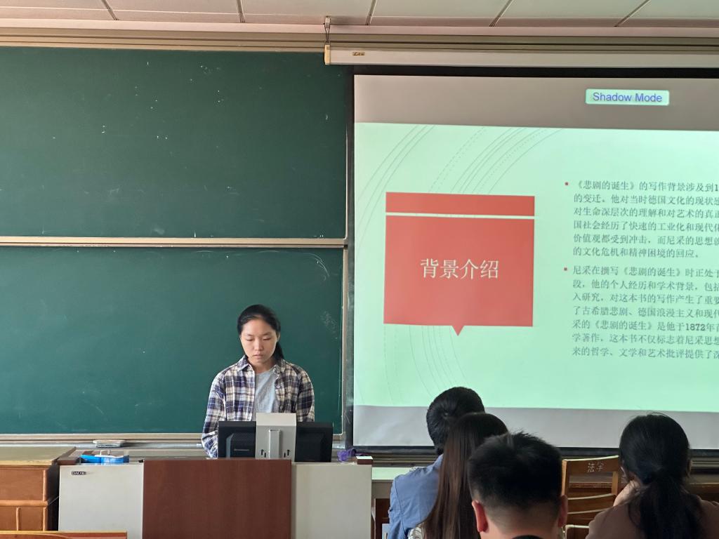 随后,2024级伊昊冉同学分享了弗里德里希·威廉·尼采《悲剧的诞生》一书。通过悲剧的诞生、死亡与重生三个部分对本书的内容进行了分享。悲剧本性在于: 它虽然深刻地洞察了自身之存在的有限性,但却并未因此厌倦和否定自身的意义;正是由于生命具有这种智慧或真理,它才会无条件地肯定和热爱自己的有限存在,甚至想要它无限次地“重来一次”。