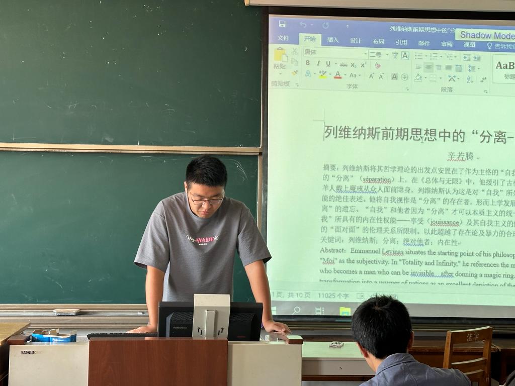 2023级辛若腾同学分享了自己发表的一篇关于列维纳斯前期思想中的“分离-内在性”问题的小论文。他针对论文中的相关观点进行了分享:列维纳斯将其哲学理论的出发点安置在了作为主格的“自我”与绝对他者(autrement)的“分离”(séparation)上,他将自我视作是“分离”的存在者,形而上学发展走向滞涩的关键在于对“分离”的遗忘。“自我”和他者因为“分离”才可以本质主义的统一体当中解脱出来,而“自我”所具有的内在性权能及其自我主义的倾向理应被自我与他者之间的“面对面”的伦理关系所限制,以此超越了存在论及暴力的合理性。