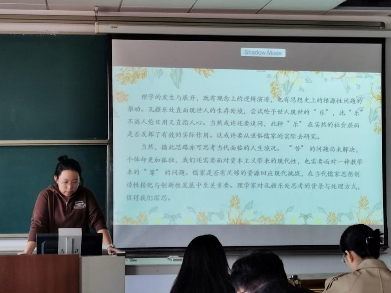 首先,2024级赵隽卿同学分享了《宋明理学》一书,主要介绍了理学的发展与演变,以及理学发展历史过程中重要的推动力,并对主要内容进行整体性概括和凝练总结。最后,她结合自己的阅读体会对周敦颐“孔颜乐处”与宋明理学的问题展开阐述了自己的观点。