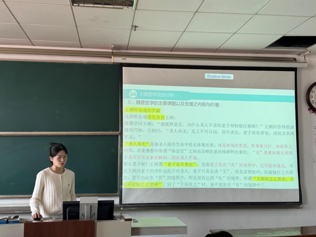 2024级仇华宇同学分享了《中国哲学十九讲》一书,主要介绍了书中关于先秦诸子的起源与周文疲敝的联系、以及魏晋玄学的主要课题等主要内容。最后,她结合自己的感想对魏晋玄学中“会孔通老”这一课题的意义与价值提出了自己的意见和看法。