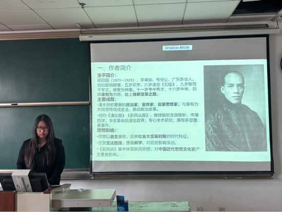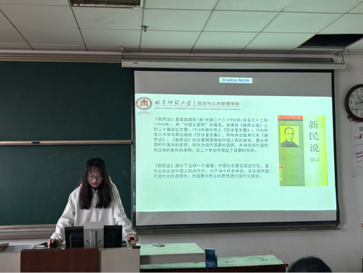 2024级秦汉如同学分享了梁启超先生的《新民说》,她则从"论权力思想"这一章节深入分析了梁启超关于个人自由与社会约束的论述,指出其既批判专制权力对个人权利的压制,又强调个人权利应当以不损害社会公益为界限。秦汉如同学特别引用了书中"人人自由,而以不侵人之自由为界"的核心观点,并提出了一个富有现实意义的问题:"在现代社会,如何平衡个人权利与社会公共利益?当二者发生冲突时,应遵循怎样的伦理原则进行权衡和抉择?"