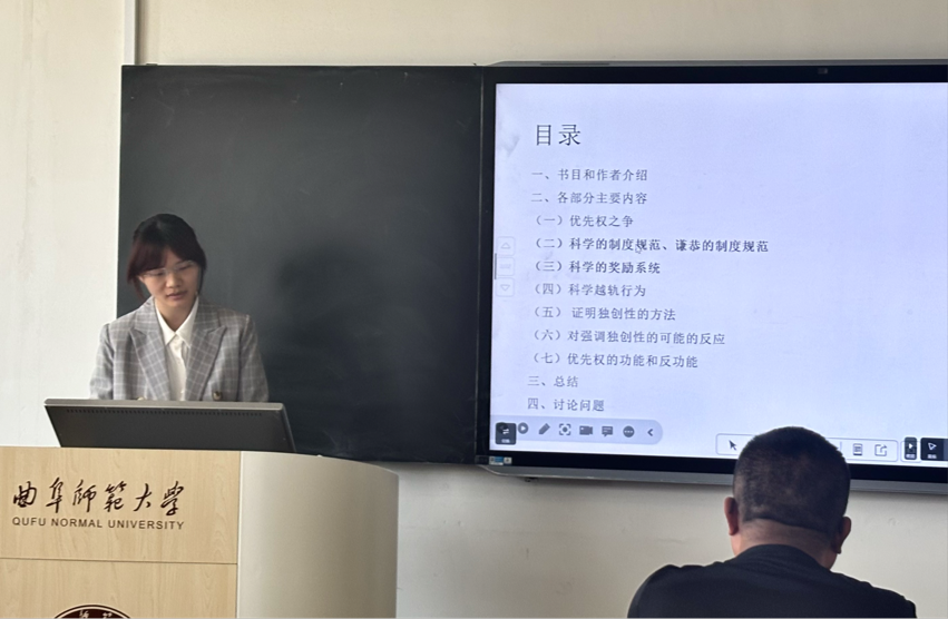 2024级王涵阳同学分享了默顿的经典著作《科学社会学》,她重点解读了书中关于科学评价的社会过程论述,最后提出"从科学发现和科学评价来谈谈,如何跳出'发表即正义'?"这一问题引发了同学们对科研评价体系改革的深入思考,大家展开了热烈讨论。
