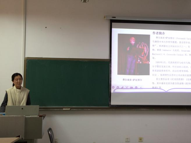 24级侯汶秀同学分享的书目是《哲学的邀请》,她分享了第七章作者对自然的解读,表示“自然”是一种文化建构,不是一个固定不变的标准,而是一个被我们不断重新定义的文化概念,并提出自然能否作为一种理想来评判现实的人类社会这一引人深思的问题。