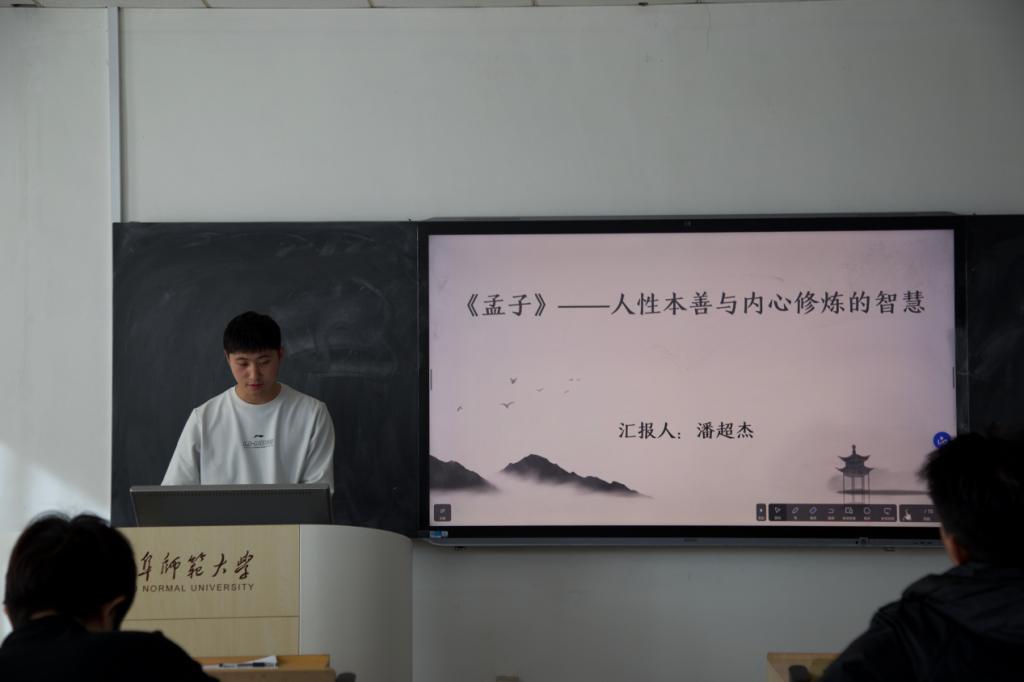 2025级潘超杰同学分享的是《孟子》,他围绕书中修炼内心的路径进行了梳理:包括以浩然之气为精神根基、反求诸己的向内反思、不动心与持其志的志向坚守,以及寡欲诚身的内心清净之法,提出“人性本善,为何人会作恶?”“如何修炼内心的强大?”等问题。
