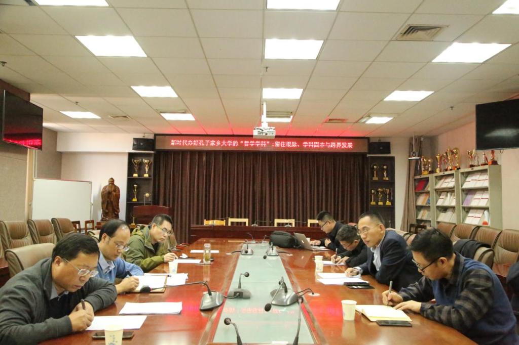 于JC909会议室召开新时代办好孔子家乡的“哲学学科”:留住根脉、学科固本与跨界发展学术研讨交流会。复旦大学马克思主义研究院院长吴晓明、南京大学哲学系主任唐正东、西南大学副校长崔延强、中山大学哲学系教授张伟、武汉大学教授陈立新、山东大学哲学与社会发展学院院长刘森林、山东理工大学马克思主义创新发展研究院院长孙民等教授应邀线上出席本次会议。脱裤吧