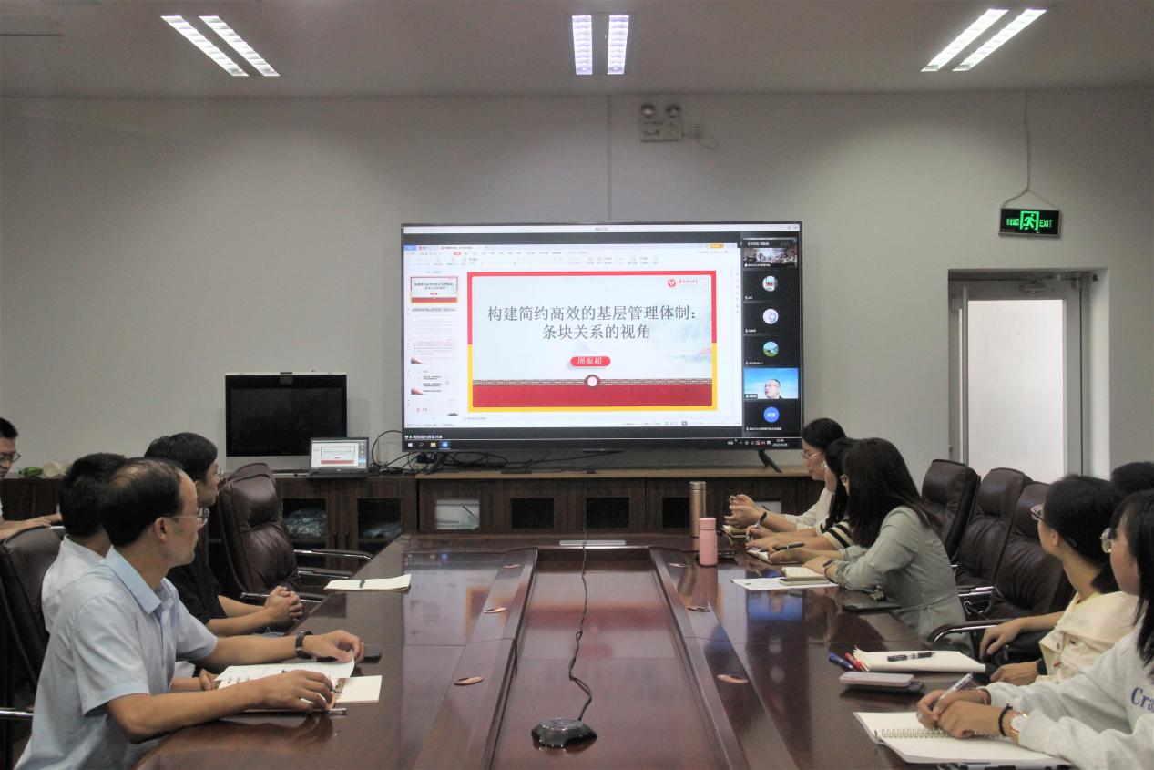 周振超教授以“构建简约高效的基层管理体制:条块关系的视角”为主题,结合自身读书学习与实地调研经历,系统地从条块关系的溯源与界定,条块关系失衡导致的基层治理困局以及构建简约高效的基层管理体制的措施等方面进行了阐释。周教授通过整合自身以往研究领域之间的联系,细致分析条块关系矛盾造成的问题,就有效提升基层治理效能,构建简约高效的基层管理体制等方面提出独到见解。在答疑环节,“线下”与“线上”师生积极发言提问,气氛活跃,周振超教授围绕大家的问题进行了详细的解答。周教授亦师亦友地建议同学们多读书、多读文件、多调研,结合实际与所学专业进行学习,寻找多种现象背后的推动因素。