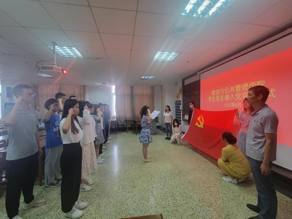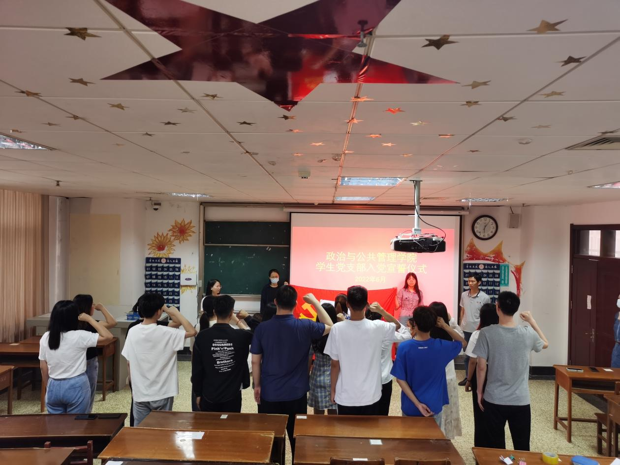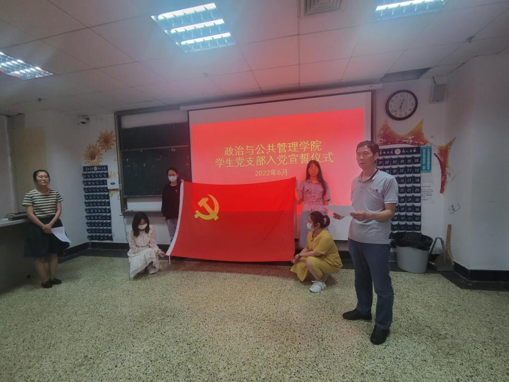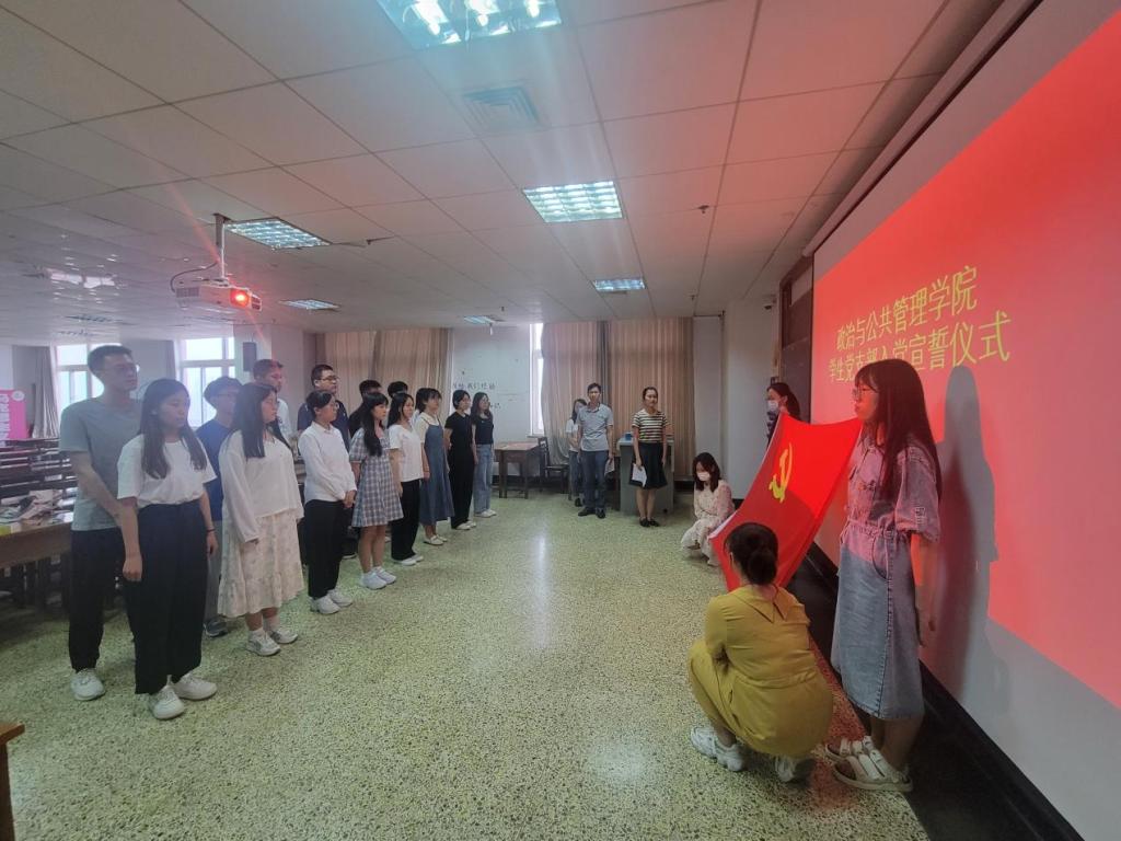 仪式在激昂的《国际歌》歌声中拉开帷幕。与会全体党员同志肃然挺立,神情庄重,缅怀为实现共产主义而抛头颅、洒热血的的前辈先烈。党支部书记耿晓敏同志代表支委致辞,她强调进行宣誓仪式对预备党员来说是入党的重要一步,是最实际、最生动的党的观念教育,也是进行自我教育的最好形式。在党旗下的宣誓,要求预备党员担起政治责任,严格要求自己,以良好的状态和优异成绩向党组织上交一份满意的答卷。