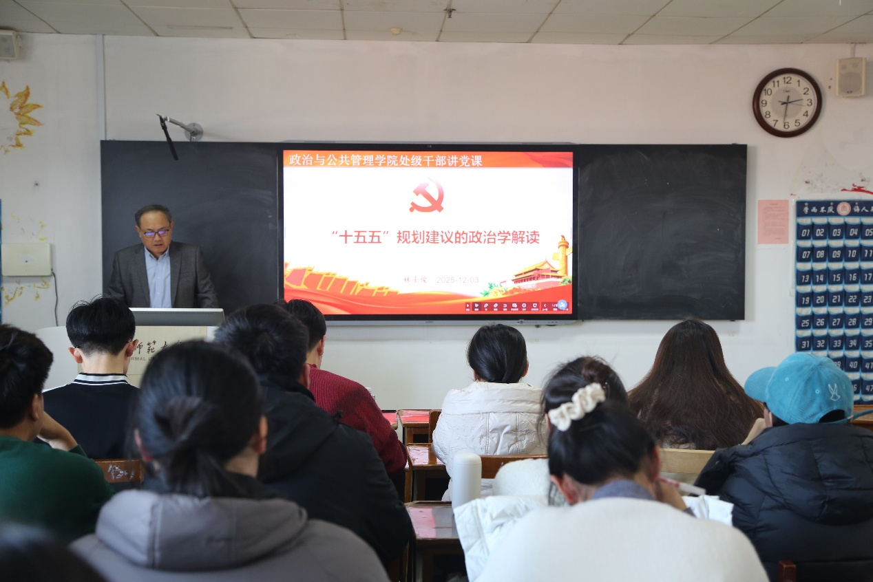 会上,林士俊副院长围绕 “十五五”规划建设展开论述,着重强调“十五五”时期是我国基本实现社会主义现代化的关键阶段。该阶段将承接“十四五”的发展成果,为2035年目标的达成奠定坚实基础。规划建议中明确指出,要将“中国式现代化”贯穿于整个规划始终。中国式现代化蕴含人本逻辑、集体优位、合共生这三大独特政治价值,为发展中国家提供了全新的现代化选择。党课还结合中美博弈、科技竞争等国际形势,对我国的各类原创性概念进行了解读,进一步加深了学生们对五年规划重要性的认知,助力他们学习五年规划所蕴含的整体观与系统思维、长期主义与战略定力等核心思维。