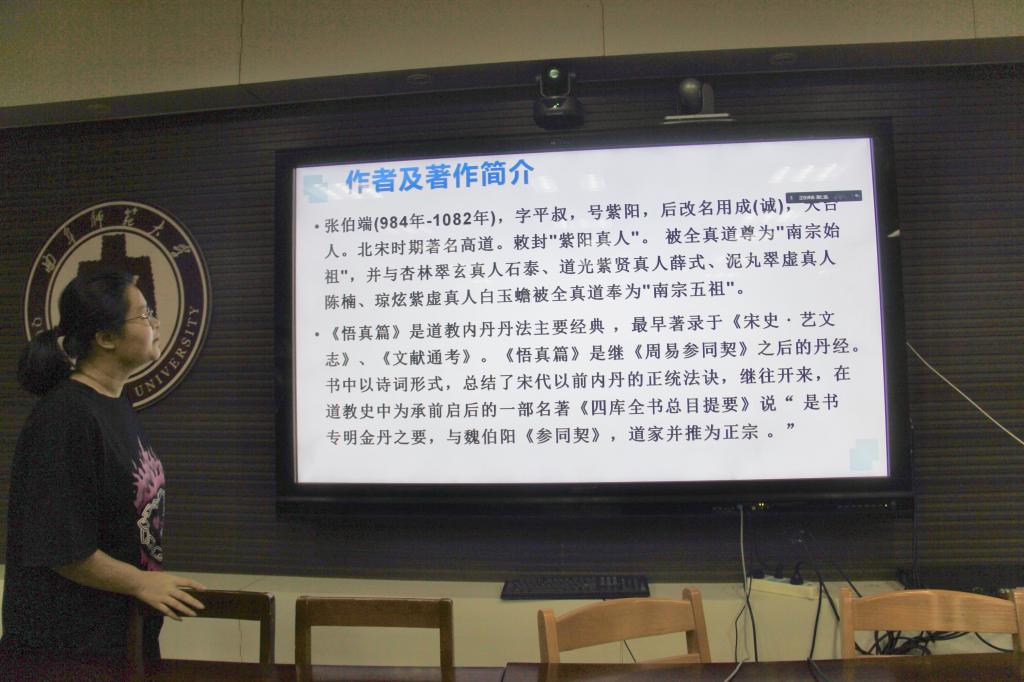 首先,2020级丁开璇同学为大家分享《中华道藏·悟真篇》,《悟真篇》是道教内丹丹法主要经典,是继《周易参同契》之后的丹经,书中以诗词形式,总结了宋代以前内丹的正统法诀。《四库全书总目提要》中这么评价道:“是书专明金丹之要川与魏伯阳《参同架》,道家并推为正宗。”
