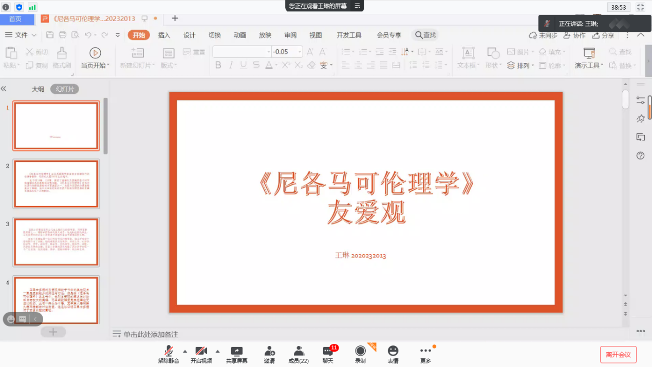 2020级王琳同学分享了亚里士多德的《尼各马可伦理学》中的友爱观。首先对亚里士多德的生平和其所著的《尼各马可伦理学》做了简要地介绍。其次,围绕亚里士多德认为人必须要有友爱的三个原因,从而进一步指出友爱观的三种类型:与以上三种为人所爱的事物即有用的、令人愉悦的和善的事物相对应的有三种友爱,即有用的友爱、快乐的友爱和善的友爱。最后,亚里士多德认为自爱是获得友爱这一德性的前提。自爱顾名思义就是爱自己,一个人只有先做到爱自己、对自己友爱,才能对其他人、对他的朋友友善。但自爱既不是利己主义也不是利他主义,是兼顾理性的自我和他人道德的善。友爱,始于爱自己,终于爱人,其从爱己至爱他人。
