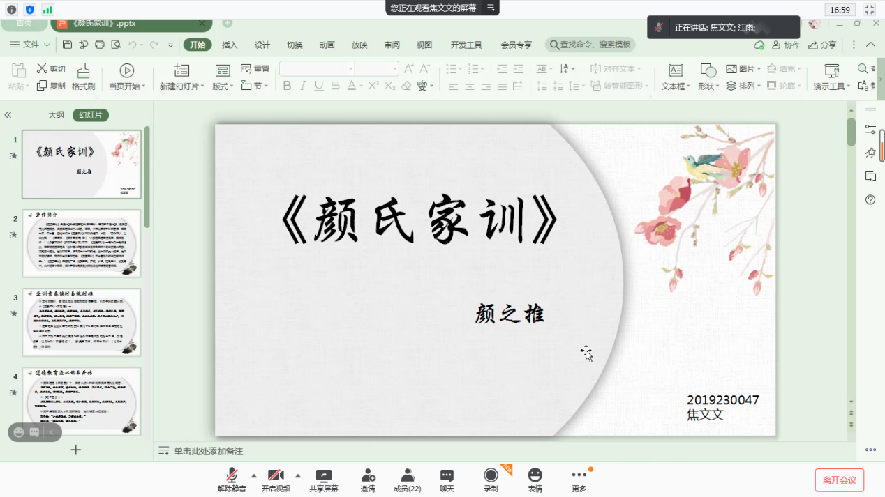 本期政研论坛读书交流会围绕伦理学相关专业书目及人物思想展开讨论。首先,由2019级焦文文同学分享了颜之推的《颜氏家训》一书。本书是颜之推记述个人经历、思想、学识以告诫子孙的著作,是以类似家书的形式告诫后代子孙按照封建社会的道德准则和处世之道,加强修养。颜之推认为儿童时期是奠定基础的重要时期,是最好的教育时机,反对对子女的放纵溺爱和偏爱不均。颜之推还强调要重视道德教育中潜移默化的作用。另外,家庭教育是人生的第一课堂,良好的家庭环境对孩子的成长也具有重要影响。