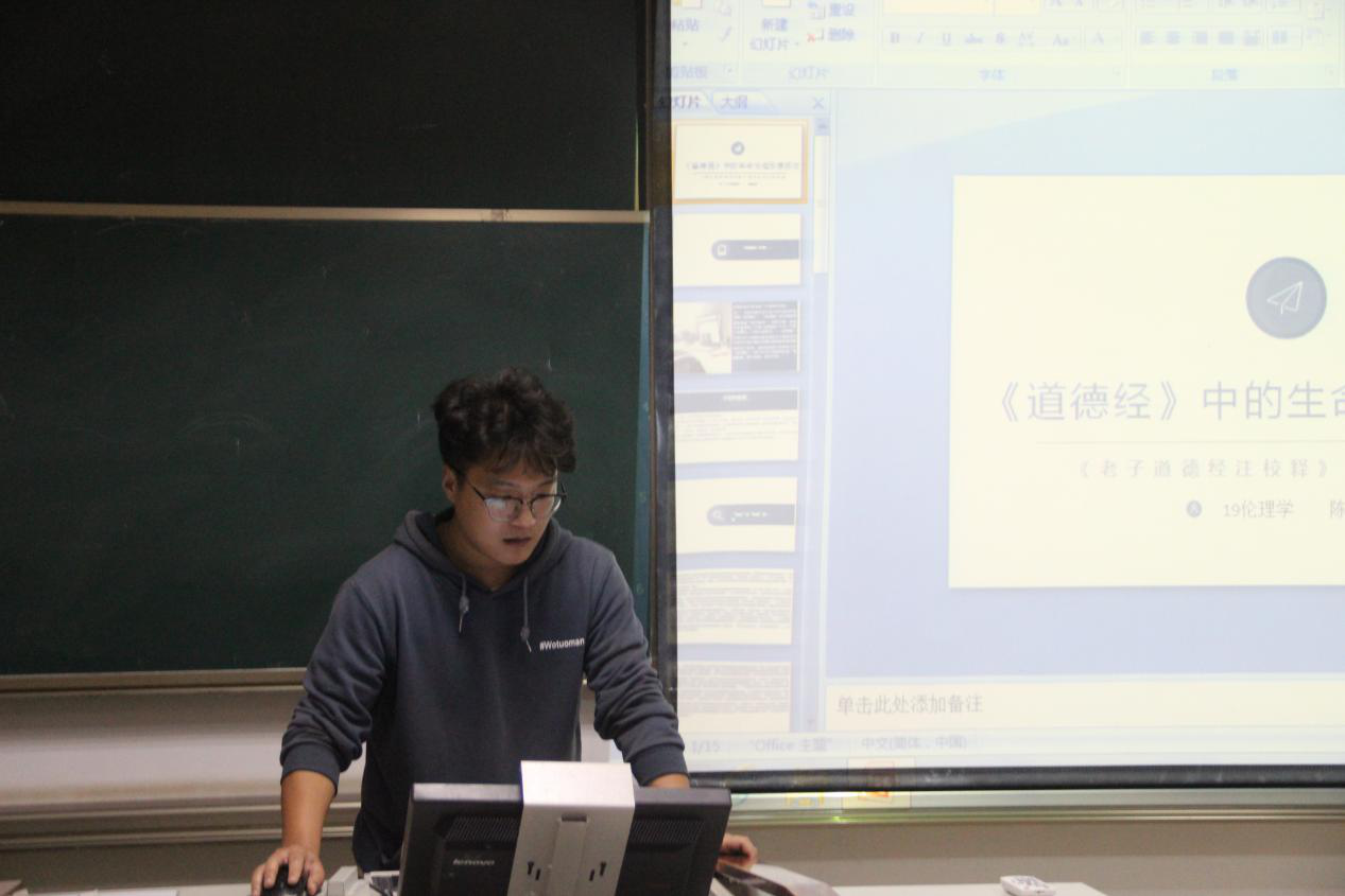 本期政研论坛读书交流会围绕伦理学相关专业书目及人物思想展开讨论。2019级陈吉彪同学分享了老子的《道德经》。从《道德经》中对生命伦理思想的探讨为出发点,具体在“修德”与“贵生”精神、生死观以及生命价值和修养价值这三个方面加以阐述。老子生命伦理思想并没有像现代西方伦理学那样,为人类找到或提供现代医学发展所带来的道德两难问题的解决方法或原则,老庄生命伦理思想是一种与观身、修身、存身、保身、贵身、爱身以及爱生等生命思想紧密相连的。这不仅能为当代生命伦理学思想研究注入中华民族的智慧,为建构具有中国气质的生命伦理学提供丰厚的文化资源,而且有助于世人更为自觉地、合乎道德地安顿自己的生命。