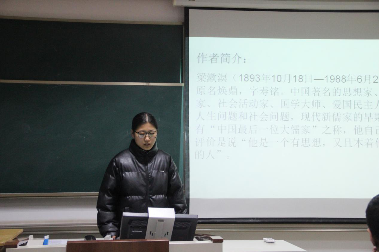 2020级刘烨斐同学分享了梁漱溟先生的《中国文化要义》。主要讲述了本书中第四章梁先生对于公德观的看法。首先是对公德观产生的原因做了简要概括。其次,对于公德观来说在书中表现在四个方面:公共观念、纪律习惯、组织能力和法治精神,梁先生认为这是相对于西洋来说我们缺乏团体生活最核心的方面,即公德。最后,将公德观联系我们当下社会的实际,要不断地完善和提高我们自身的公德,使自己更好地融入社会中,进而使我们的社会更好的发展。