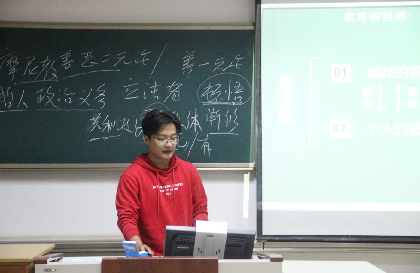 2019级陈吉彪同学分享了柏拉图的《理想国》中教育伦理思想。首先,教育伦理思想的基础是天赋品德论,从学习即“回忆”中阐明了德性知识的来源;其次,柏拉图把“善”的理念的实现作为其教育目的,必须要掌握善的内容;再者,柏拉图指出在初等教育到高等教育阶段,要遵循音乐教育、体育教育、辩证法和实践锻炼的顺序来进行学习;最后,对如今教育的启示中要遵循受教育者的身心发展规律,循序渐进的进行,但它的教育目的性太强、阶级固化现象严重也是应该看到的局限性。