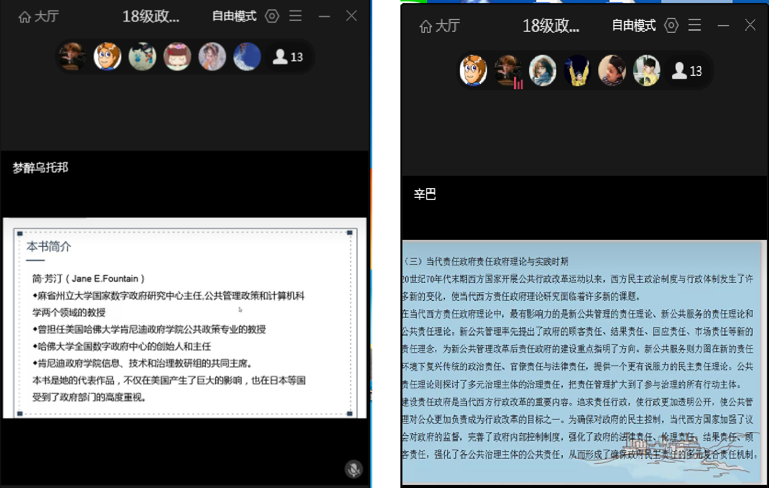刘喆同学结合当今政治学研究热点选题就简·E.芳汀的《构建虚拟政府:信息技术与制度创新》进行了读书分享。她从本书简介、主要内容、研究局限以及反思总结四个方面进行了分享。在对本书进行了理论与实践两个层面的大体概括之后,着重说明了信息技术发展与制度创新对政府管理的深刻影响。她认为,随着我国政府确立了建设服务型政府的方针,虚拟化和网络化则构成了当今政府变革的两大背景。在虚拟政府中,作为基本框架的科层结构将保留大部分的控制性规则,同时也更多地运用促进性规则,对虚拟政府的网络结构起到一种“润滑”的作用,促使职能活动更加顺畅。