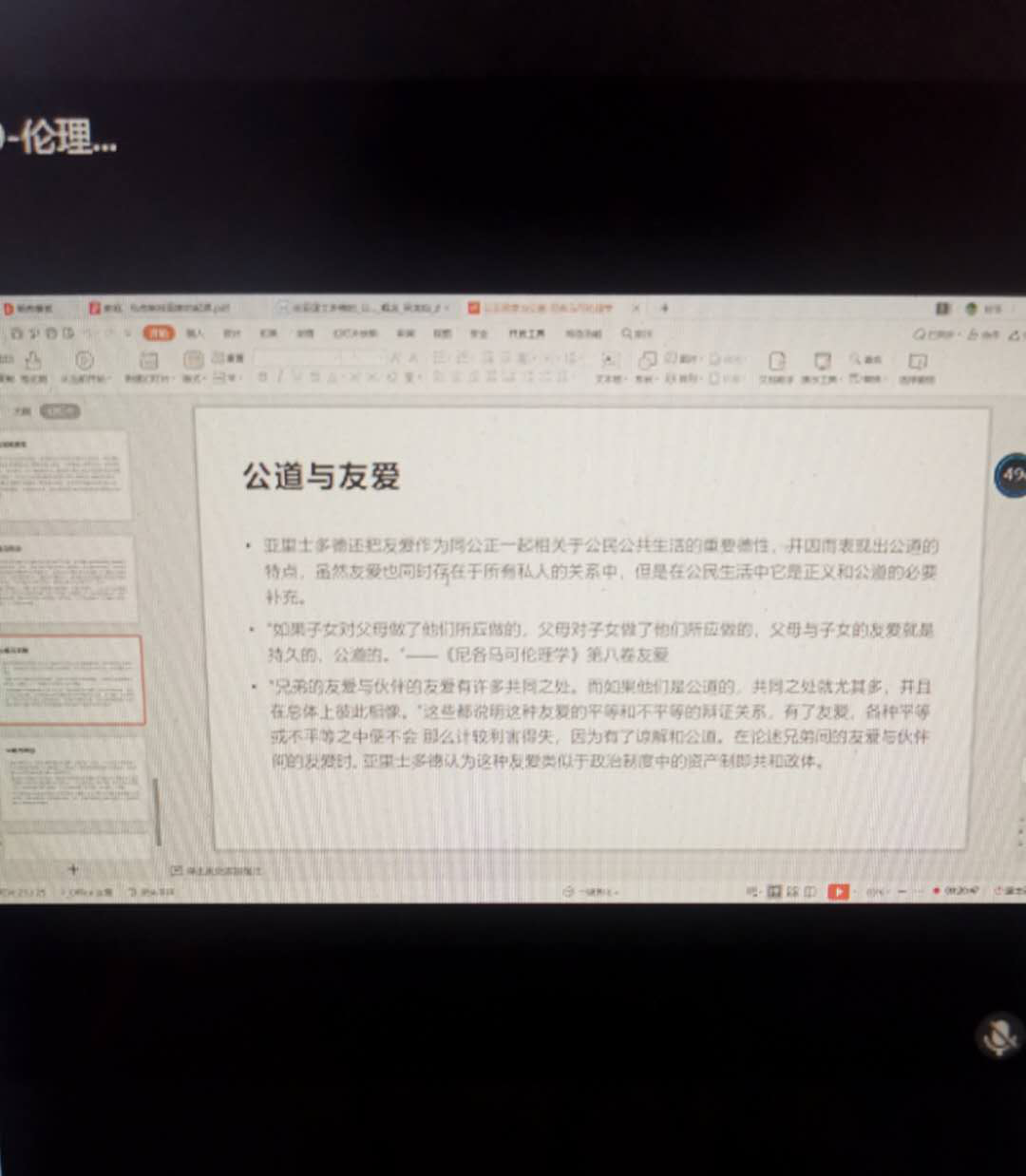 本期读书会围绕伦理学相关书目及相关人物思想展开讨论。2019级陈吉彪同学对亚里士多德的公正与公道思想进行详细讲解。重点分享了公正的性质与范围、具体的公正、分配的公正、矫正的公正、回报的公正五部分。在亚里士多德看来,公正是指一种品质,使一个人倾向于做正确的事情,并愿意做公正的事。要克服不公正,一方面要制定完善的法律。另一方面让公民养成自觉遵守法律的习惯。