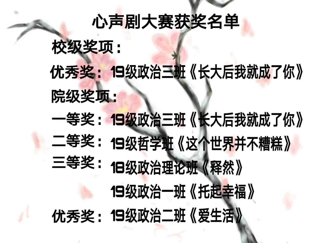 举办心声剧院内评选活动。本次活动由院学生会心理部主持开展,全体学生积极参加。向学校推送的19级政治三班作品《长大后我就成了你》在学校大赛中获得优秀奖,其他作品分别获得学院二、三等奖和优秀奖。