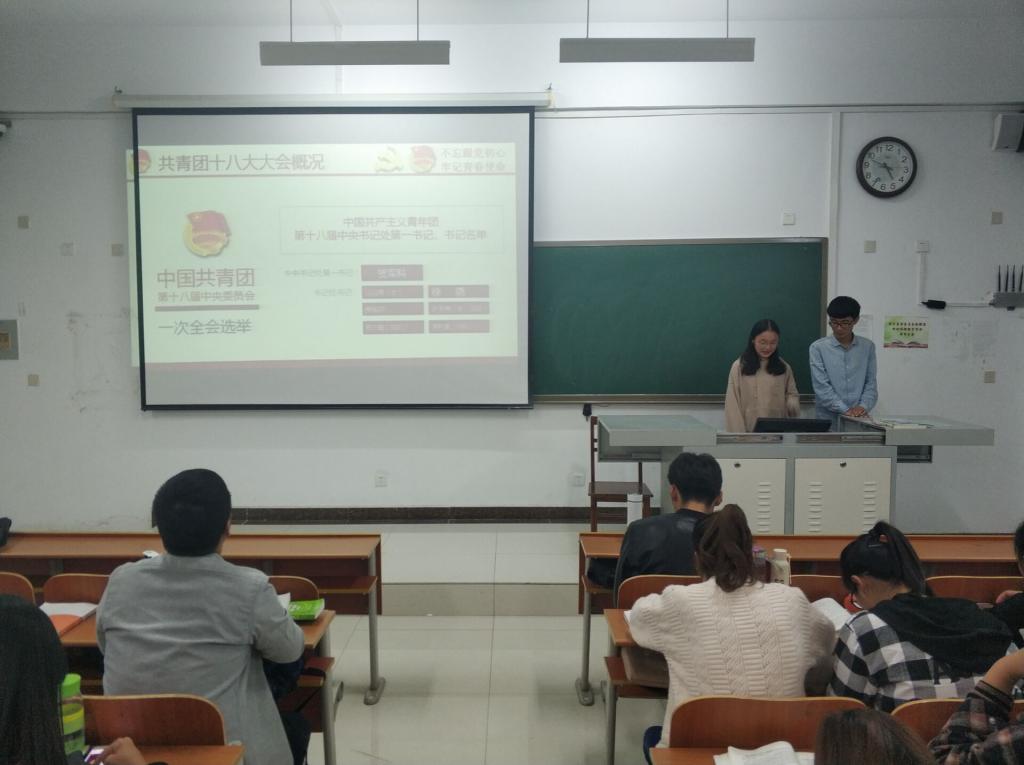 本次主题团日活动分为“团十八大精神学习”和重温入团誓词”两部分。各班团支部书记精心准备PPT,各团支部从“团十八大会议概况”、“团十八大中央致辞”、“团十八大报告分析”、“团十八大团长修改”四个方面展开讨论。各团支部团支书着重带领大家认真学习团十八大党中央致辞,号召全体成员认真学习和遵守党中央对共青团员的五点希望,做合格共青团员,并组织团支部成员将新旧团章进行对比,指出新团章的“新”、“亮”之处。除此之外,各团支部书记还从团十八大报告中的八大部分出发,对团十八大报告进行全面系统的分析和介绍,让团员们充分了解过去五年共青团的成就和共青团的未来规划。最后,各团支部书记带领全体团员共同起立宣誓,重温入团誓词。
