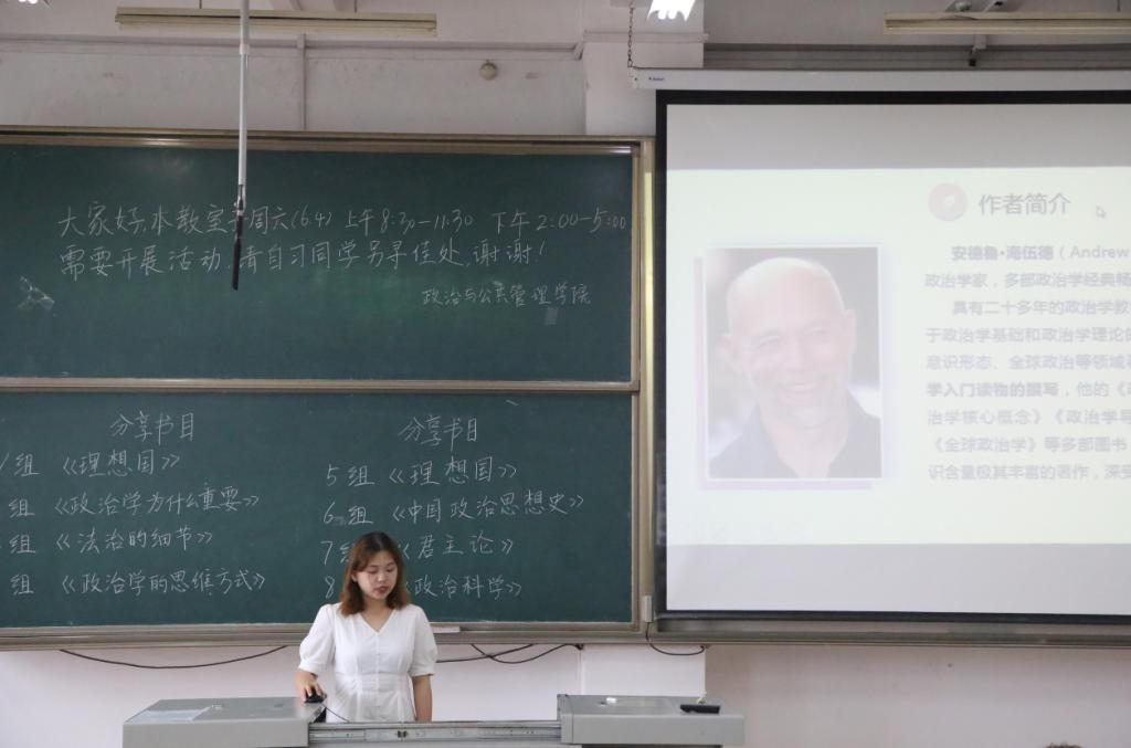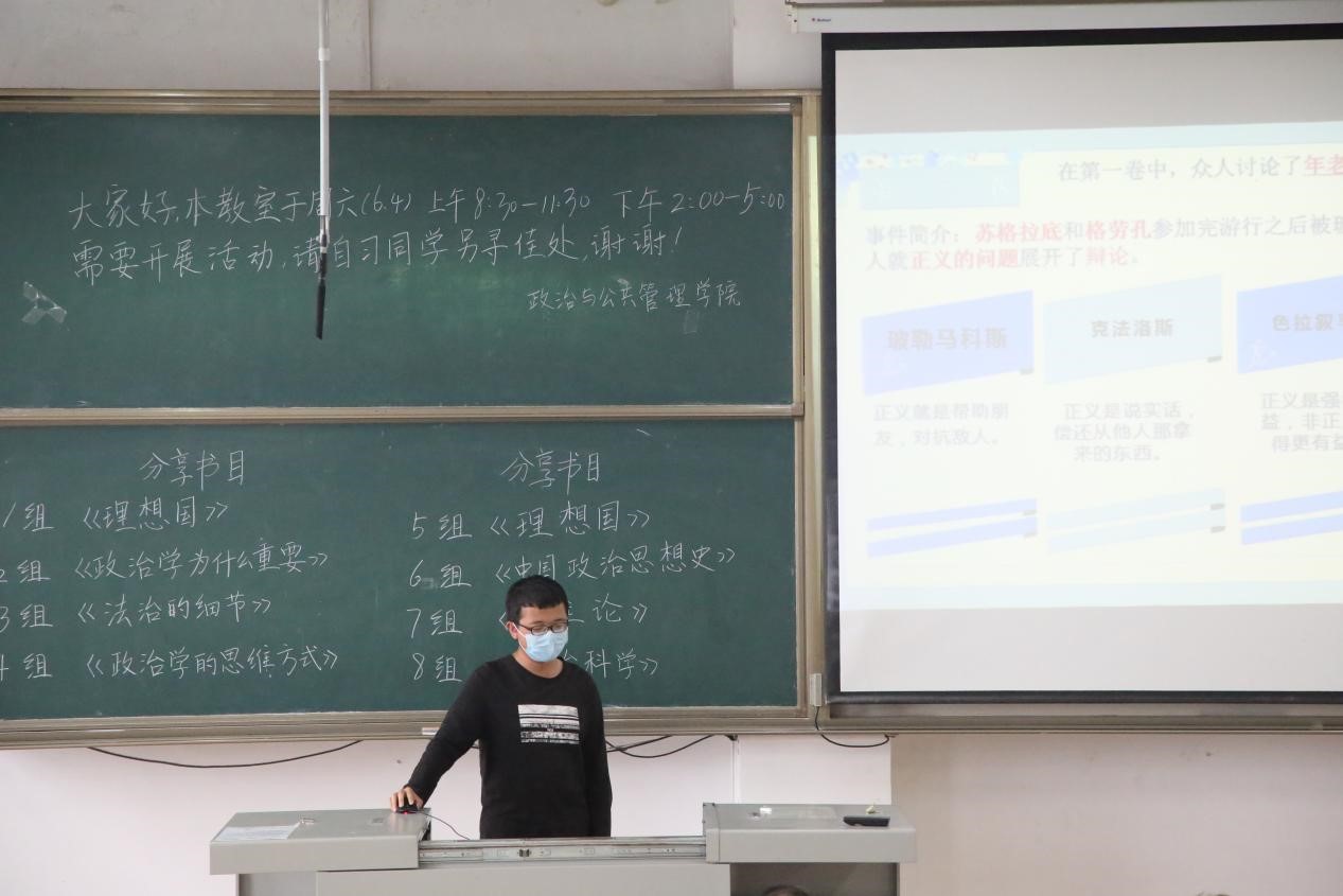 比赛伊始,学习部代表讲述阅读经典著作的重要意义并预祝同学们取得良好成绩。本次比赛2020级共有七组同学展示读书成果,主要涉及《宅兹中国——重建有关“中国”的历史论述》、《沉思录》、《国际政治的社会理论》、《寂静的春天》、《政治哲学史》、《近代中国社会的新陈代谢》等书目;2021级共有八组同学展示进行读书汇报,主要涉及《法治的细节》、《中国政治思想史》、《理想国》、《政治科学》、《政治学的思维方式》等书目。