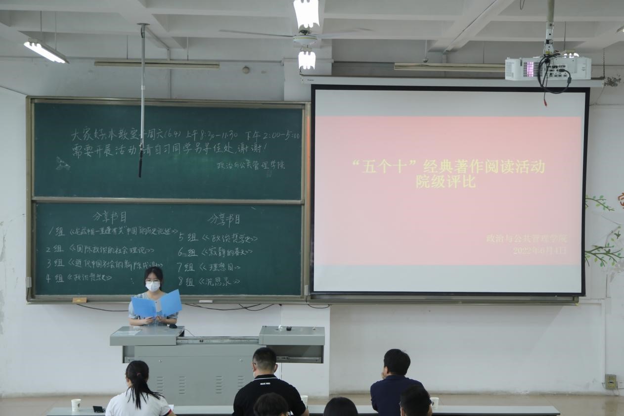 结合校园文化建设工作实际,于6月4日在JA302举行政读书第十五期暨2020、2021级“五个十”经典著作阅读院级展示评比活动,本次活动由脱裤吧