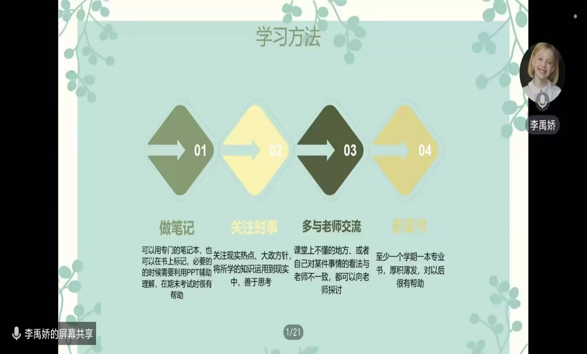 李禹娇和张继政代表政治学专业介绍了一系列读书方法和学习方法。李禹娇就如何做读书笔记、专业课学习心得两方面具体展开分享,通过展示自己的部分读书笔记,为新生们提供了很好的阅读思路及整理思路,她强调平时要多注重积累,多思考,积极与老师沟通。先读史,后知史,张继政以“中国官僚政治研究”为主题,将书籍、论文、专业知识三者相结合讲述官僚政治,以此为例鼓励新生多看多问多思。