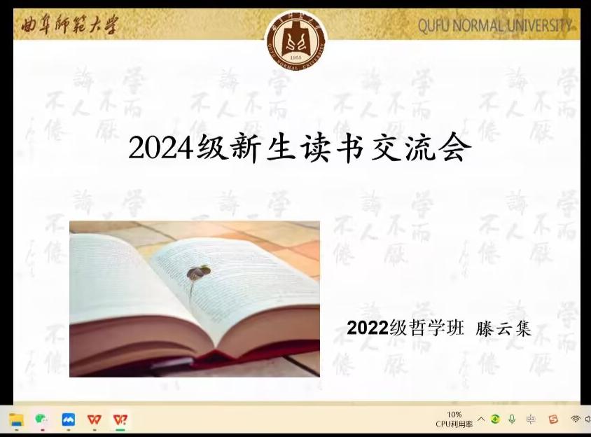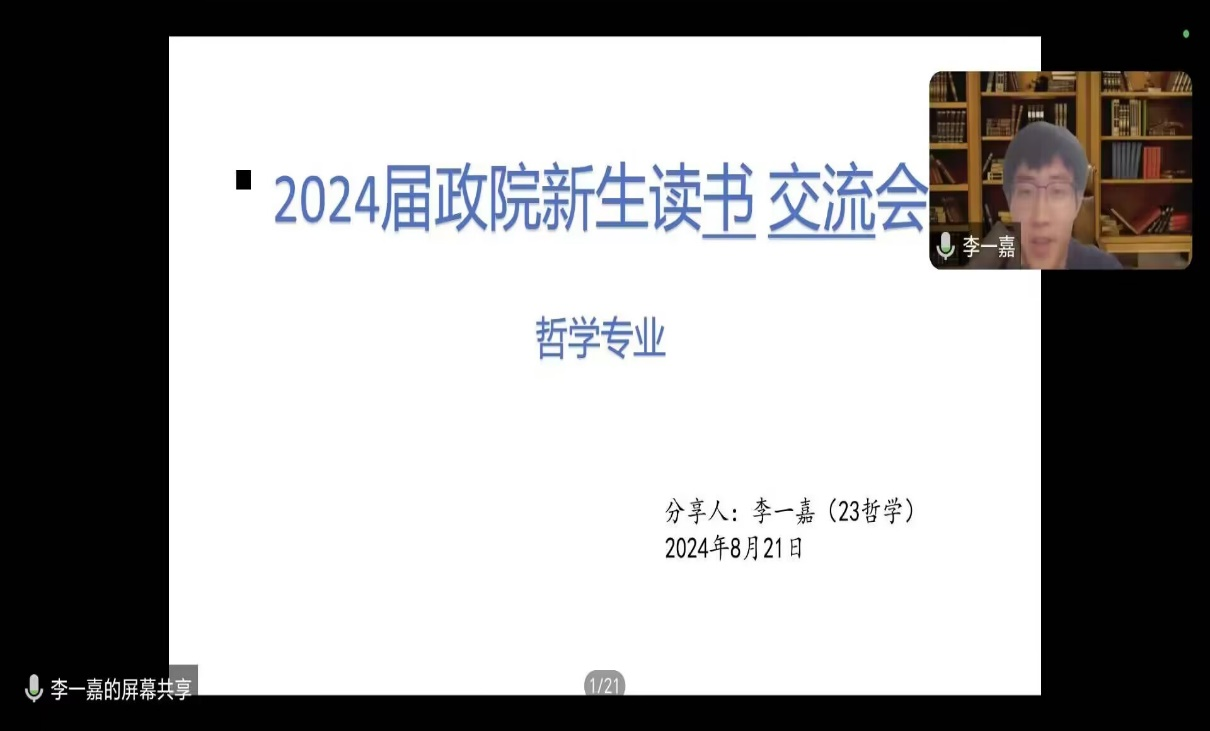 本次交流会分别邀请2022级哲学班滕云集、2022级政治学与行政学二班李禹娇、2023级哲学班李一嘉、2023级政治学与行政学二班张继政四位优秀师哥师姐向2024级新生分享读书心得以及学习经验。