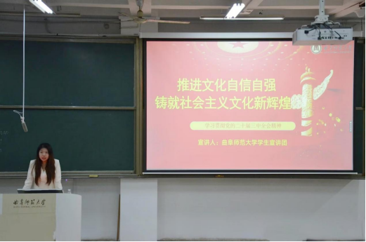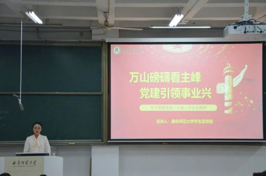 学生宣讲团通过“推进文化自信自强,铸就社会主义文化新辉煌”和“万山磅礴看主峰,党建引领事业兴”两个专题,对会议进行深入解读。