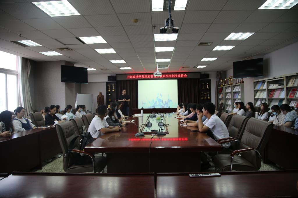 9月5日下午于JC909举行研究生招生宣讲会暨上海政法学院政府管理学院领导来访交流会,学院党委书记卢瑞霞、副院长李增元、党委副书记张忠凯、副院长林士俊、上海政法学院政府管理学院领导出席,上海政法学院杜建军主讲,2018、2019级同学和辅导员积极参与。