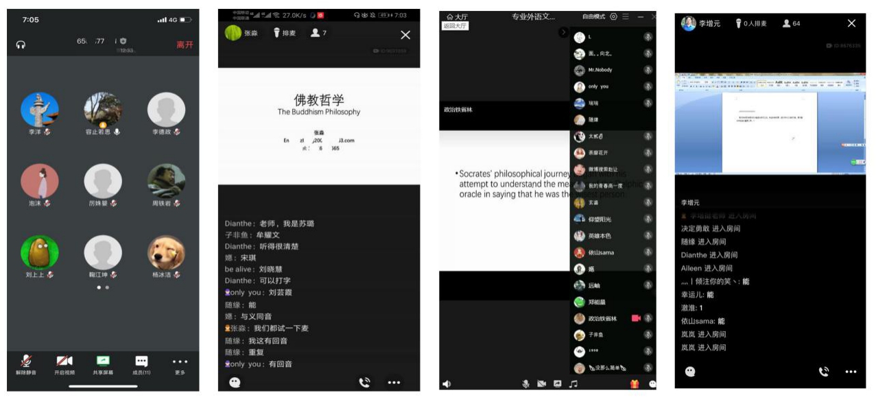 教师按照正常的教学计划分别为不同专业研究生开展了《马克思主义哲学经典著作研究》、《西方伦理思想史》、《中国哲学经典著作选读》、《专业外语文献精读》、《儒学哲学研究》等课程的线上教学,通过课前预习、课程教学过程中课件的实时分享以及课堂讨论交流等方式,使线上教学高效且生动。老师和同学们纷纷表示网络教学的实际情况是理想的,保证了教学活动的正常进行。在课堂中,老师们的努力付出和精彩讲解也深深感染着屏幕前每一位同学,同学们也秉持着认真的学习态度,遵守网络课堂秩序,师生之间积极互动,展现出脱裤吧