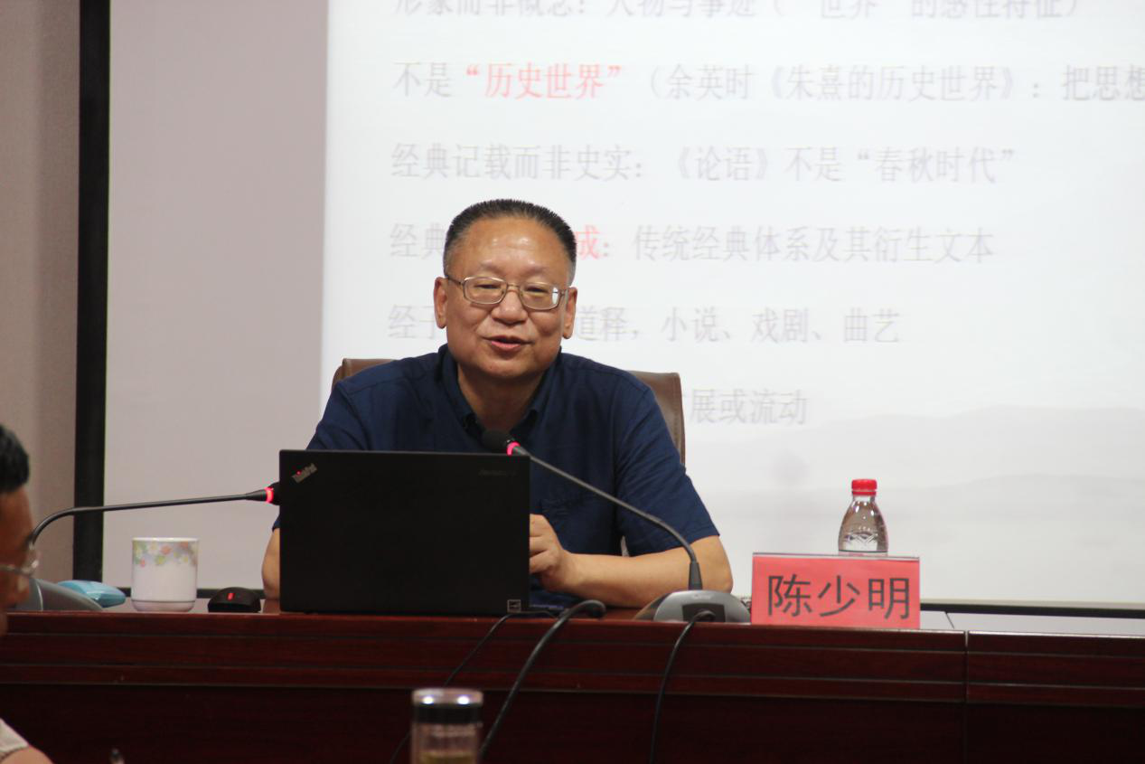 陈少明教授从十个部分讲述“经典世界”的主要内容:第一,如何描述经典的力量,他强调“经典世界”是一种整体分析,既不是“思想世界”也不是“历史世界”,经典世界是由传统经典体系及其衍生文本所构成;第二,分析起源:言传与文本;第三,介绍记事与记言的文本类型;第四,进入“历史”中,他强调进入经典途径主要通过影响、名声、提点来实现;第五,从《论语》、《庄子》、《史记》三种不同文本来阐述孔门师弟;第六,经典化的生命力,脱离原本的经验背景,独立的生命力;第七,思想的矿藏;第八,影响历史的模式:投射与互动,他指出三种模式即链式、投射式与互动式;第九,重提“想象的共同体”;第十,经典解释、文化史与知识社会学。随后铁省林教授与陈少明教授围绕本次报告会内容展开了一次中西方哲学的思想碰撞,陈少明教授儒雅的气度、渊博的知识、学术的严谨、体系的厚重性都给师生们留下了深刻印象。