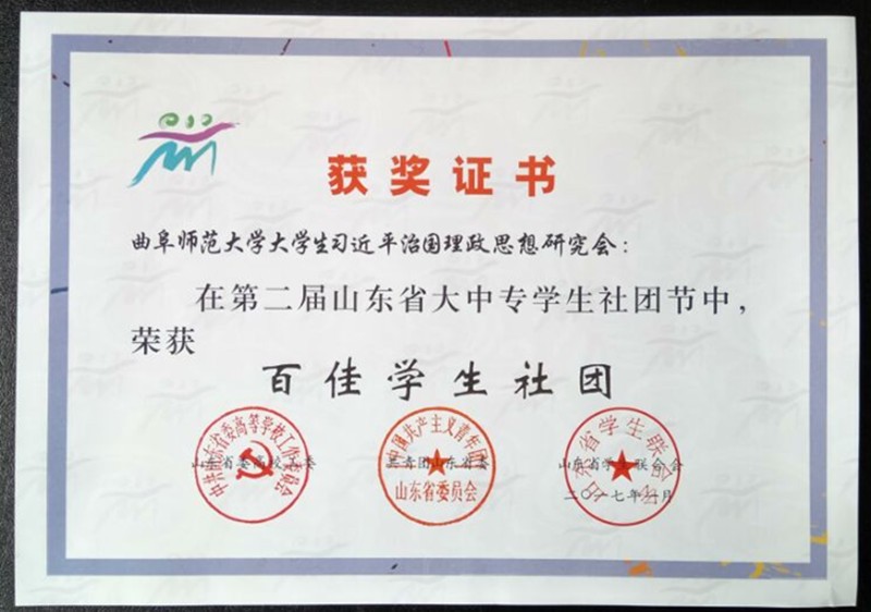 近日,省委高校工委、团省委、省学联隆重表彰了在“第二届山东省大中专学生社团节”活动中表现优异的单位和社团。我校团委、杏坛文学社和我部大学生习近平治国理政思想研究会荣获“百佳学生社团”。