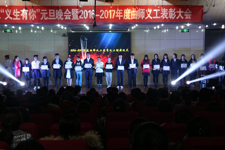 义工服务大队“义生有你”元旦晚会暨2016-2017年度曲师义工表彰大会于图书馆报告厅成功举行。马克思主义学部教授张晓琼,思想政治教育系主任肖芳,学部党委副书记刘进,团委书记陈敏,辅导员张华,日照市义工联合会副会长陈晓波,日照市义工联合会副会长潘远红,日照市交通局科长赵军伟 ,日照市公共自行车管理中心运行主管刘吉祥,山海天消防大队文员孙梦娜、刘佳,结核所预防科科员秦雪玲,日职义工服务大队队长李恒水,日职爱国社社长张云奎应邀出席,2016级全体同学积极参与。