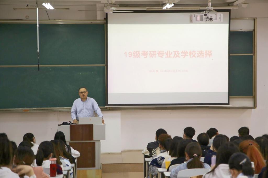 会议伊始,王元如老师针对当前就业整体形势及未来考研的新变化进行了简要说明,点名就业指导与考研辅导班会主题。随后,副院长林士俊围绕如何选报专业、如何选报学校、学院考研政策以及如何准备复习等方面展开详细介绍和分析,全方位多层次地为同学们进行了事例丰富、数据精确的指导。他强调考研过程中政治与英语两门学科的重要性,提醒大家要根据自身的条件选择合适的报考院校,将考研复习计划尽早提上日程,合理安排时间,注意劳逸结合。最后,林院长建议同学们在慎重选择基础上进行针对性准备,可以积极响应国家号召支援西部计划。