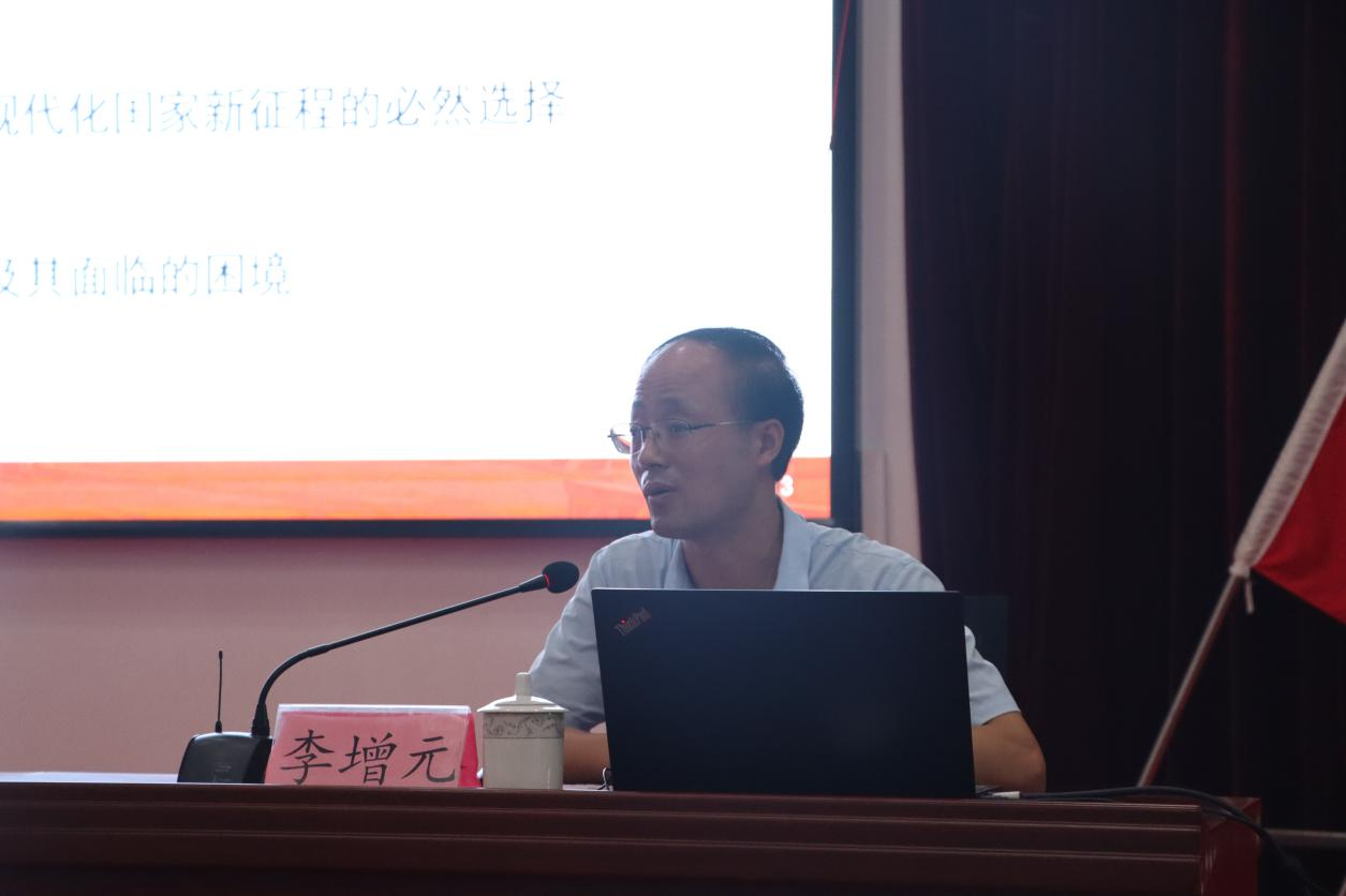 中心主任李增元教授以《新时代乡村振兴典型实践模式及几点思考》为题,从21世纪以来乡村振兴战略的提出及推进、乡村振兴的主要内容、乡村振兴的典型模式、第一书记及领头人推动乡村振兴的做法和特点、乡村振兴如何推进五个方面出发,以落实乡村振兴重点任务、聚焦基层重点领域与关键环节的视角,为全镇党员进行了深入浅出的讲解。