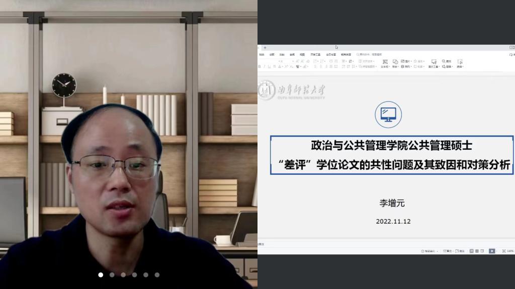 副院长李增元对近三年MPA不通过学位论文做了分析报告,对MPA“差评”学位论文的共性问题及其致因与对策进行了详细分析。他指出,要加强文献综述与研究方法的训练,筑牢学生基本功,通过多读多写多练,将研究方法内化于心、外化于行,同时导师要与学生勤交流,多沟通,加强过程管理,严格落实各项制度。