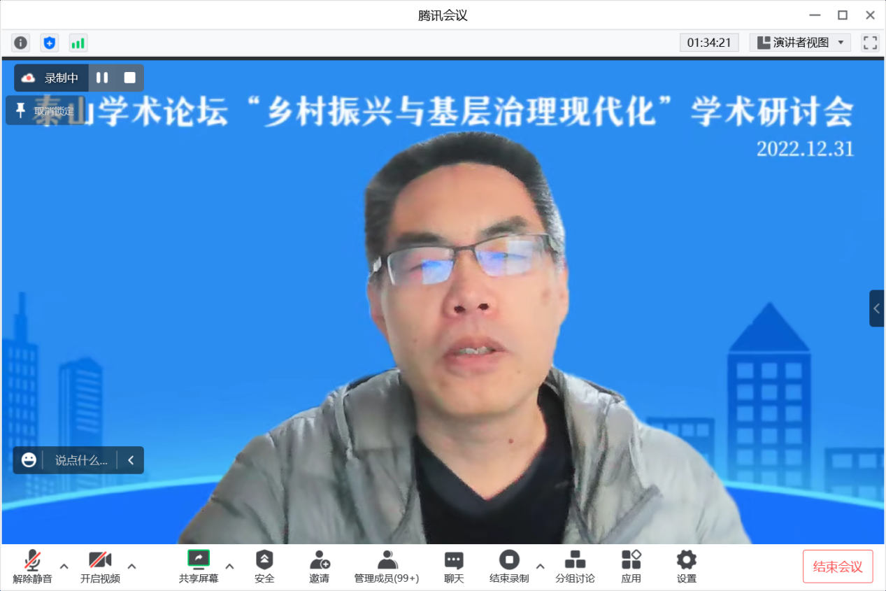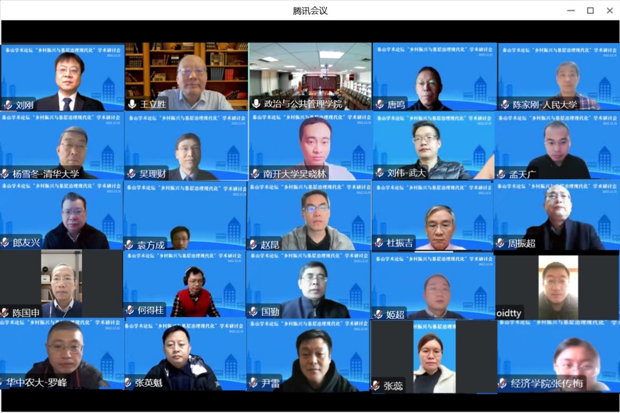 、乡村振兴与城乡基层治理研究中心承办,《齐鲁学刊》编辑部协办的“乡村振兴与基层治理现代化”泰山学术论坛于“腾讯会议”平台在线举行,来自中国社会科学院、清华大学、中国人民大学、南开大学、华中师范大学、武汉大学、浙江大学、安徽大学、西北农林科技大学以及脱裤吧