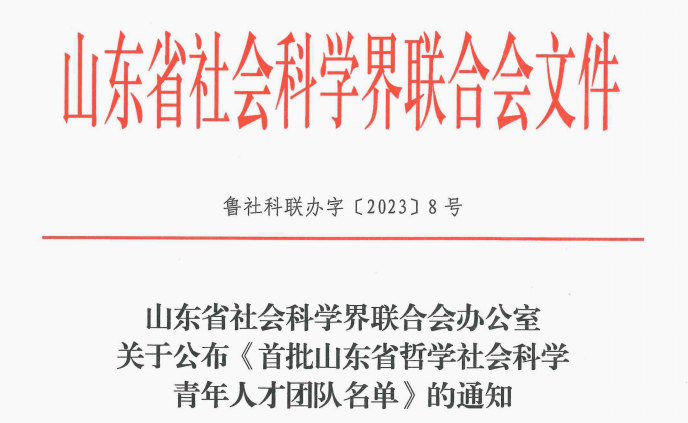 (通讯员:李苗苗)近日,山东省社会科学界联合会公布了《首批山东省哲学社会科学青年人才团队名单》,由李增元牵头组建,尹雷、徐自强、张蕊、杨伟荣为核心成员的“新时代中国特色社会主义乡村治理现代化研究团队”成功入选。