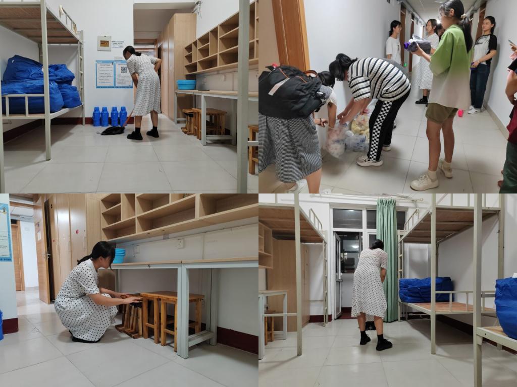 9月6日学院学生会和迎新工作志愿者为新生打扫宿舍卫生,聚焦宿舍的每一个卫生死角,做到不留灰尘,让寝室以一种新的面貌来迎接它的“新主人”。