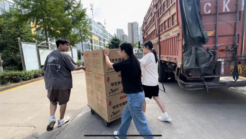 9月4日学院学生会和迎新工作志愿者为新生搬运部分生活物资。