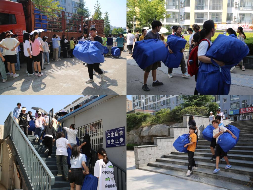 学院学生会和迎新工作志愿者为新生搬运被褥