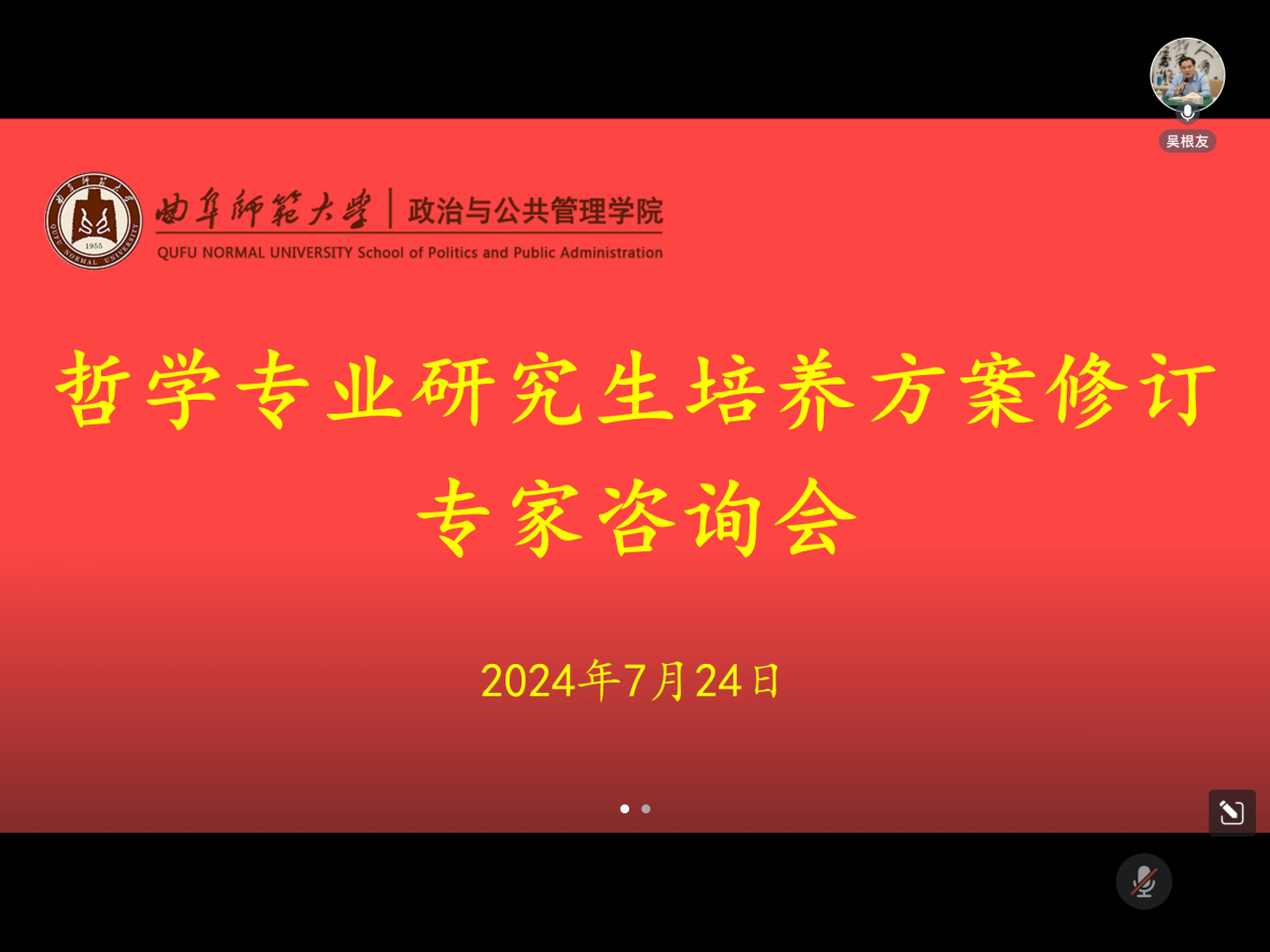 于7月24日下午组织召开了哲学专业研究生培养方案修订专家咨询会。本次会议采取线上的方式,邀请中央民族大学中华文化研究院院长、教育部教学指导委员会委员、博士生导师刘成有教授,武汉大学文明对话高等研究院院长、教育部教学指导委员会委员、博士生导师吴根友教授,中国人民大学杰出青年学者、中国人民大学哲学院博士生导师黄志军教授以及山东大学哲学与社会发展学院哲学系主任、中国诠释学研究中心主任、博士生导师王丁教授等专家进行指导。脱裤吧