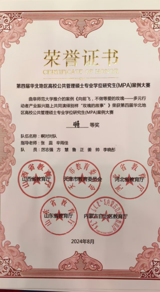 本届大赛共有来自华北地区共30所高校的60支代表队400余名师生参赛。24日上午,60支队伍分别在六个小组赛场进行了30场一对一精彩对决,每个小组赛场的第一名(共6支队伍)晋级总决赛。啊对对队以小组赛第一名的成绩顺利晋级总决赛,并在晚上的总决赛中取得特等奖第一名的优异成绩。啊对对队(队员:厉志强、方慧、鲁正、姜帅、李晓彤)荣获大赛最高奖项“特等奖”,《向前飞,不做等爱的玫瑰——多元行动者产业振兴路上共同演绎别样“玫瑰的故事”》荣获最佳案例奖,张蕊副教授、辛雨佳博士荣获“最佳指导教师”称号,姜帅同学荣获“最佳表现奖”。