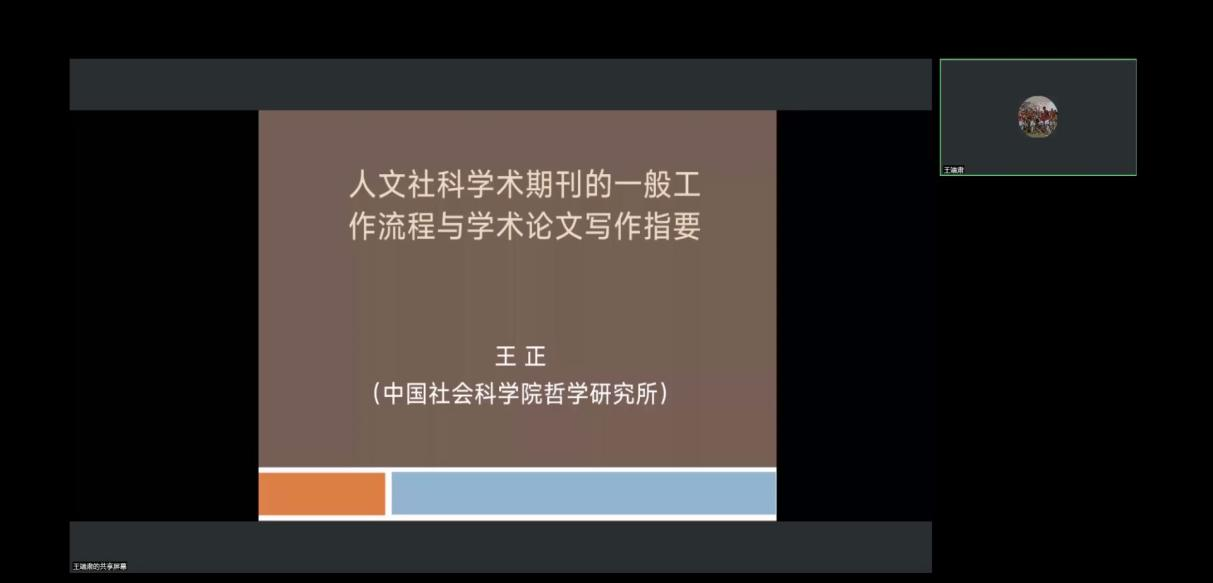 于线上举行“学术写作的过程与疑难”专题讲座,学院邀请中国社会科学院哲学研究所编审、《中国哲学年鉴》副主编、中国社会科学院大学哲学院王正教授在线作专题报告。讲座由脱裤吧